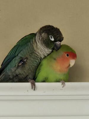 Must go together turquoise conure, Jade, bonded with lovebird, Lucky Bear. Come with large cage, sta...