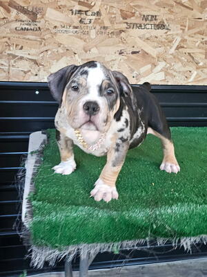 Meet our adorable Black Tri Merle American Bully puppy, a charming male ready to steal your heart! T...