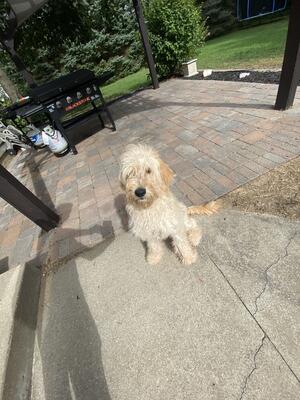 1 yo, unfixed male Goldendoodle. Good with children, house broke and crate trained....