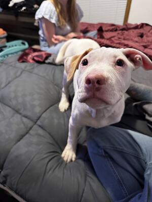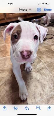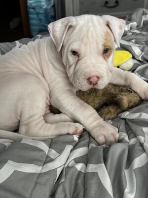 Hello meet tthis sweet little bully mix. His name is Cass. He is almost all white little bit of tan ...