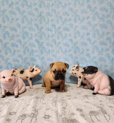 French bulldog puppies, Sire is red fawn with no mask, dam is red fawn with black mask. Puppies are ...