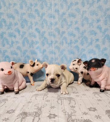French Bulldog puppies, Sire is red with black mask, Dam is blue merle. Puppies are raised in our ho...