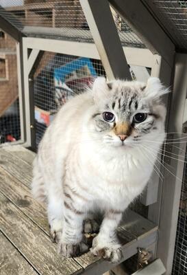 HIGHLANDER FEMALE, 2 years old, curled ears, natural stub tail and polydactyl feet, Ice blue eyes. S...