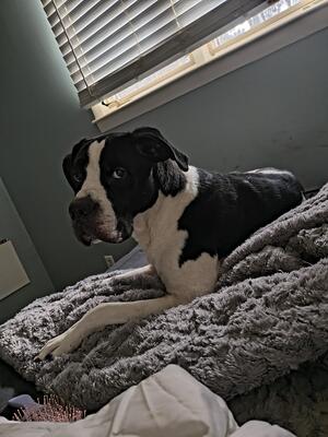 I have a 6-year-old St Bernard Dalmatian American bulldog mix he is the biggest baby very smart thin...