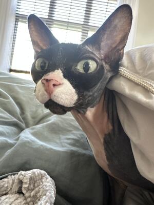 This is a 4 y/o grey Sphynx Female. She has a loving temperment and is extremely loyal to her owners...