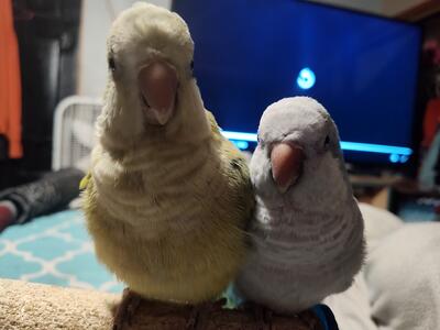 1 Green Quaker hatched February 16 2025 1 Blue Quaker hatched July 11th 2025 Both friendly ...