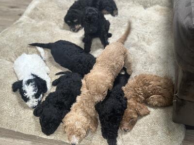 We have 9 precious mini golden doodles for sale. Mom is a black poodle weighing 35lbs. Dad is a F1b ...
