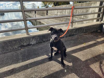 He's a little over a year and a half. He loves to go on walks and loves to work. He's a Game dog so ...
