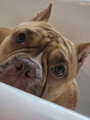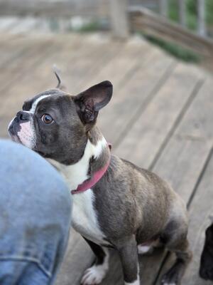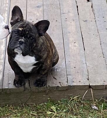 Brindle French Bulldog, curious, cuddler, great lap warmer, has big white chest and a grey beard. H...