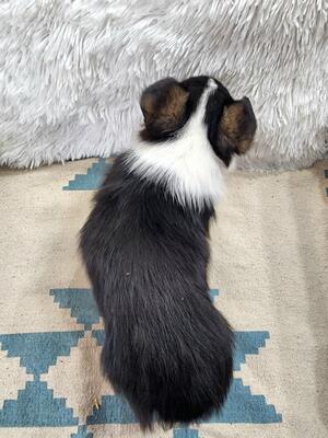 Black with white band and blaze, left blue eye, chipped. Done growing and is SMALL, very much “tea...