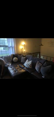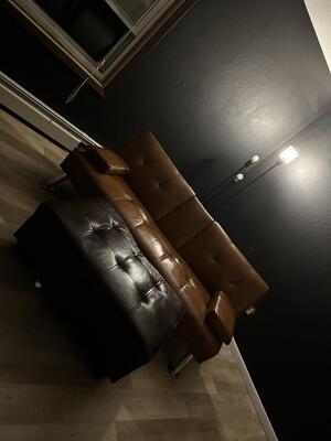 Dark brown leather couch. Perfect for a small living room. Has a couple cat scratches. Comes apart. ...