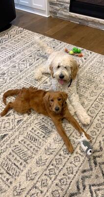 have one female goldendoodle with straight hair she is mini. One male goldendoodle curly hair. Both ...