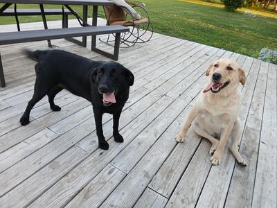 Rehoming 2 lab retrievers (one golden, one black). Spayed females, sisters, 3.5 years. May take one ...