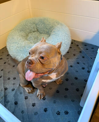 American bully female Lilac/White, pet home only, has hip dysplasia managed well on OTC hip /joint s...