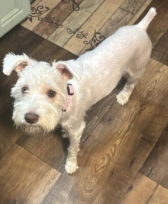 Adorable female mini schnauzer, she is 7 months old. She is white with chocolate points. Potty tra...