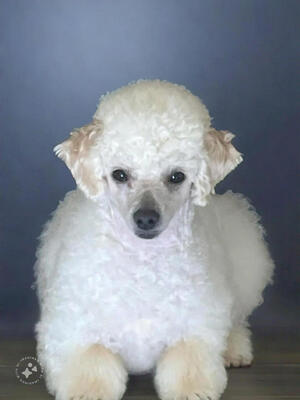 Purebred mini apricot parti poodle. 10 lbs and 15 inches as the shoulder. He’s super sweet and sma...