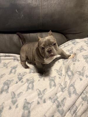 4 1/2 months old. Lilac male Micro exotic bully left. He is short, compact, & thick with a huge head...