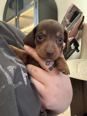 Mini dachshund puppies born 1/27. 4 boys. Mom is short hair and dad is long hair. Mom and dad were ...