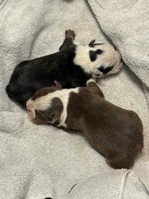 Ready now. 1 female. 1. Male. both black/white parti. Will be UTD on shots and deworming. Parents...