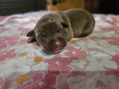 Female chocolate Merle 4 months old. Doing well with crate, pad and house training. Been around kids...