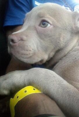 Lilac American Bully pup (White chest, paws with jBlue Eyes Dob 11/14/2023. Male. 4/224 20 weeks ...