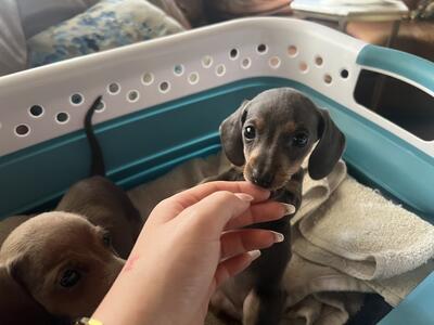 CKC Registered Miniature Dachshund Puppies.DOB 5-17-25. Mom(Lady) is an Isabella and White Pibald. ...