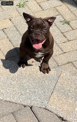 1 year old female chocolate American Bully Pup. Lemon Drop grand daughter/ Spazz 2.0 daughter....
