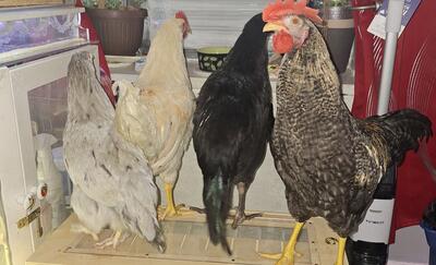 Four young chickens born on January 2025. They are hand raised. 3 hens and 1 rooster already crowlin...