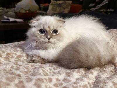 Short lambkin/ munchkin cross female, seal point white with big blue eyes is looking for a forever, ...