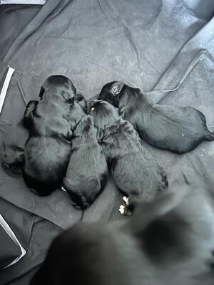 5 black labradoodles some with white paws and one with tan and white looking for their forever homes...