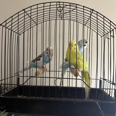 1 Yellow Green, 1 Blue! Plus Tall Pretty Cage! 130.00 For All! Only 8 mos!...