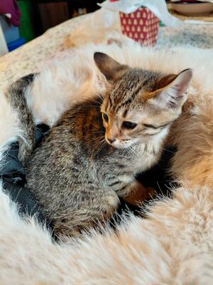 ADOPTED This playful brown tabby and white male was born 5/2/25 is still looking for his new home...