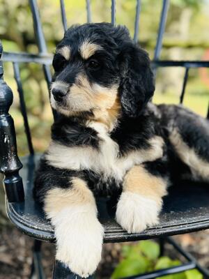F1 Standard Pyredoodle female. This girl is a unique and beautiful tricolor. She is so kind, sweet a...