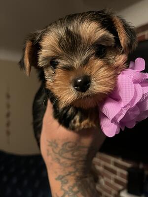 6 week old Yorkie pup, this pup will be between 4 to 5 pounds when full grown she’s a beauty, tail...