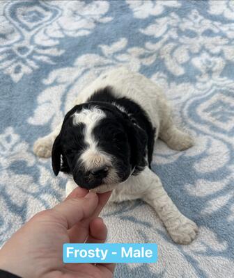 Meet Frosty. A striking black and white parti AKC Standard Poodle male with bold markings. Our pup...