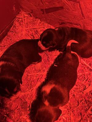 Two male blue tick beagles born Jan 27. Just started eating soaked puppy chow. Are chubby and play...