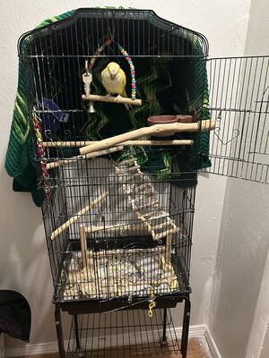 About a year old, believed to be male not DNA tested makes sounds & talks comes with food and a cage...