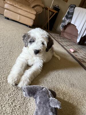 Male 10 week Mini Saint Berdoodle. One brownish grey eye and one half blue eye. He’s spunky and cu...