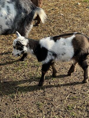 Nigerian Dwarf Wether DOB 02/24/2025 Dye Twin Acres Chanse, White random black and brown Clos...