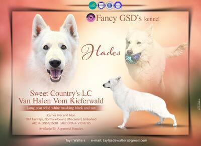 Long coat solid white carrying liver and blue German Shepherd for stud