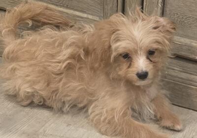 Male poodle 4 months of age toy apricot and cream poodle has one green eye looking like does well wi...