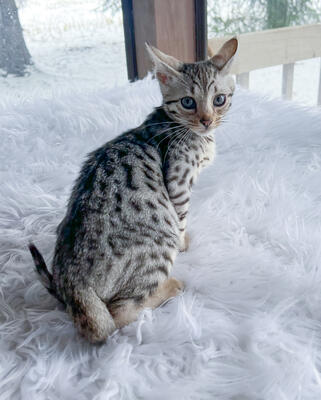 For sale. F7 SBT Silver Spotted Savannah male, loaded with dark inky spots. Klaus is a clean bright ...