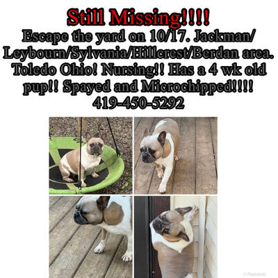 Mayhem went missing 10/17 Toledo Ohio jackman/leybourn/berdan/hoilles/lockwood area She has a pup...