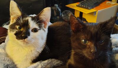 Sweet, loving 12 week old kittens. Female is black and white. Male is black. Good with dogs larg...
