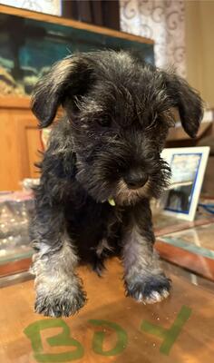 One male black miniature schnauzer left born August 14th 500.00 tails and dew claws removed 1st shot...