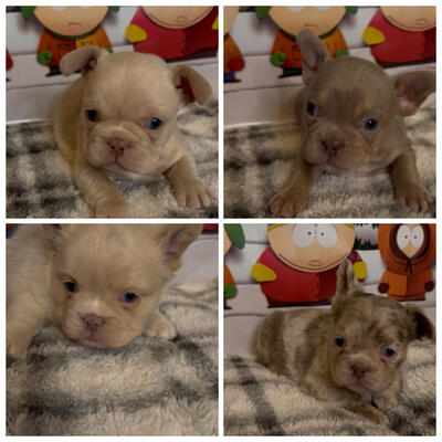 Two fluffy Frenchie boys and two standard coat Frenchie boys ready just in time for Christmas...