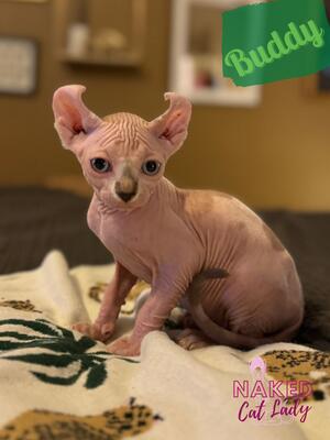 Buddy the Elf is a standard sphynx with curled elf ears. He is bi-color with green eyes. He is spunk...
