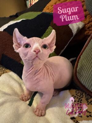 Sugarplum is solid white and stark naked! She has piercing green eyes, short legs, and the cutest ev...