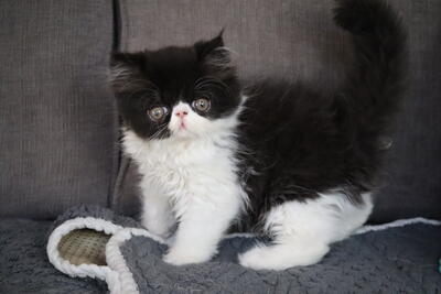 Cfa registered breeder has a black and white Bicolor Exotic long hair. Uses Litter. Very affectionat...