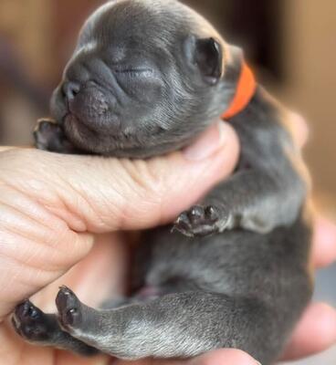 Pumpkin Pi (Orange Boy) DOB: 03-14-2025 Sex: Male Color: Blue Brindle Dam: Aggie (Pickles ...